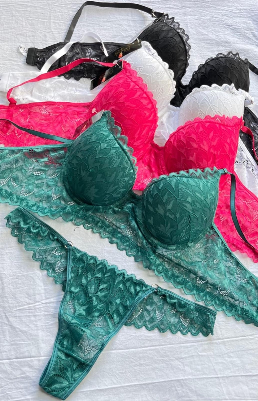 Conjunto con tasa soft y puntilla. Corpiño tipo bralette, bombacha cola less