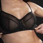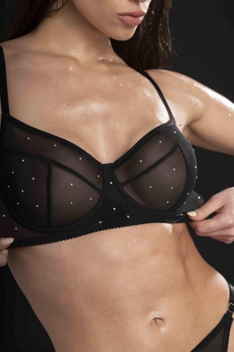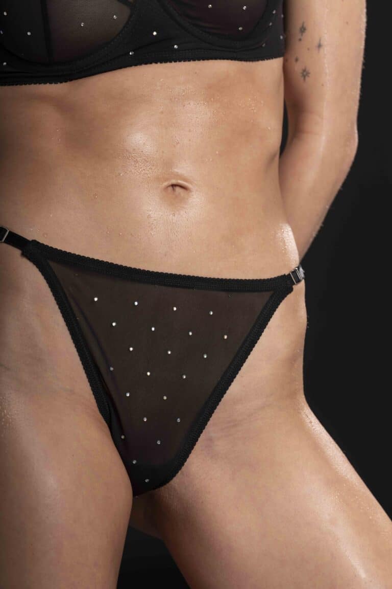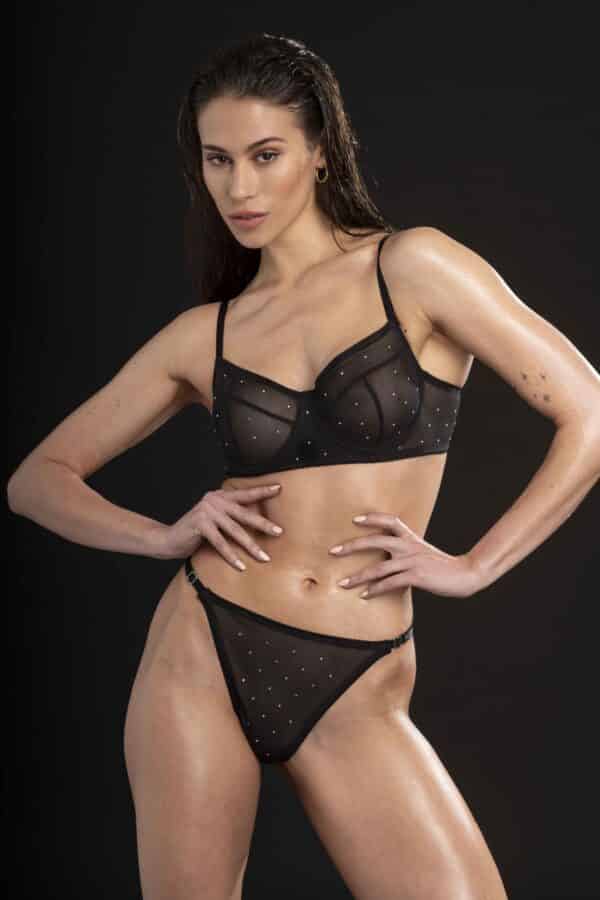 Conjunto premium, de corpiño con aro sin forro, sin relleno y breteles regulables + less regulable. Confeccionado en microtul con delicados strass tornasolados