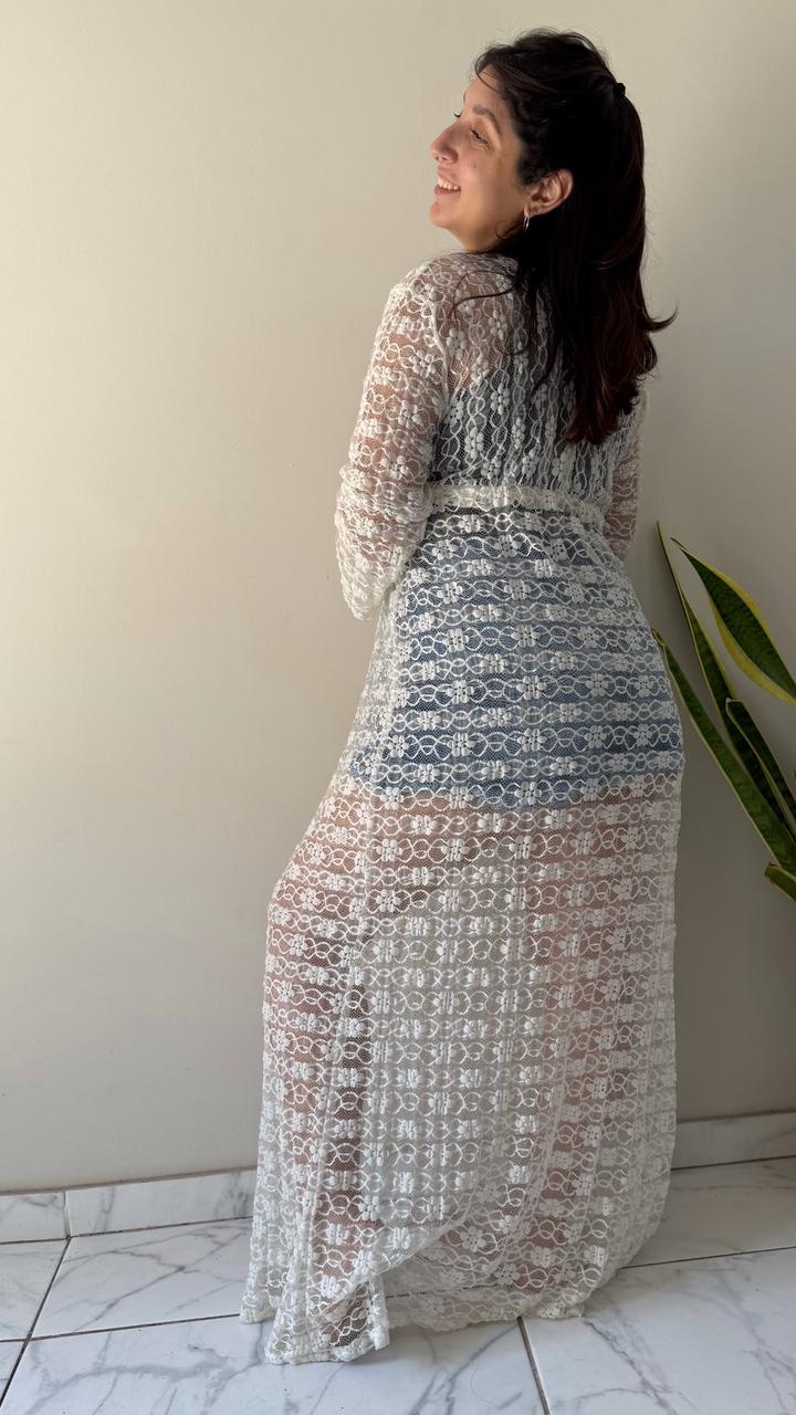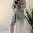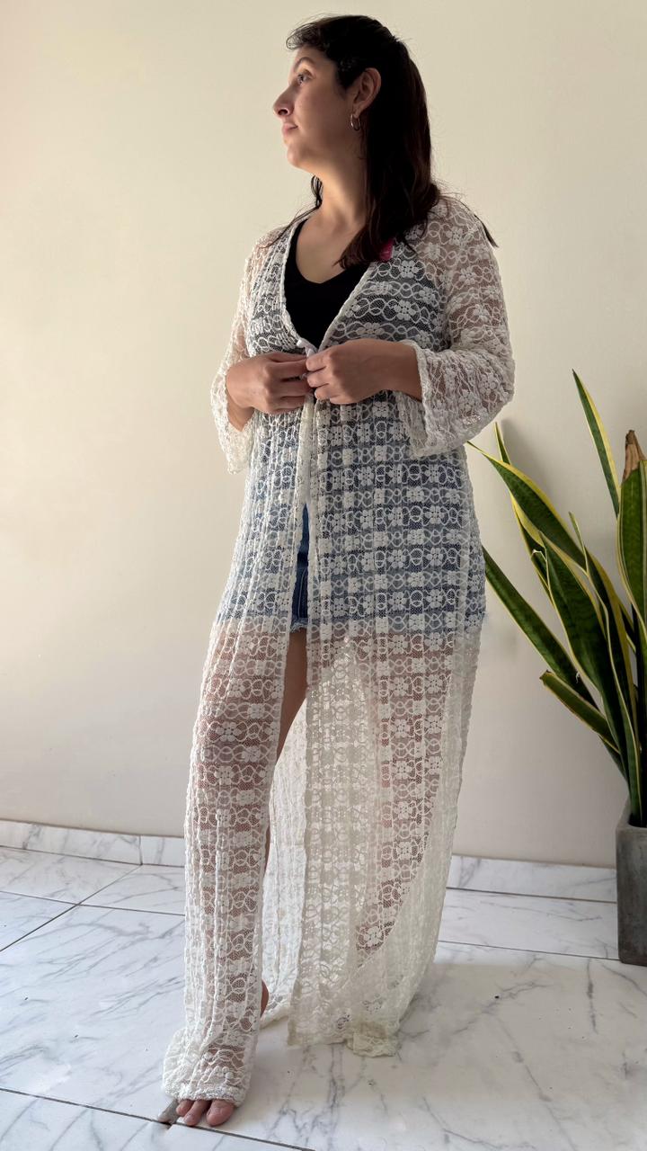 Kimono amplio de microtul tiene un lazo para atar en el centro del busto. Color natural