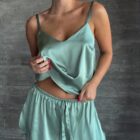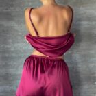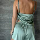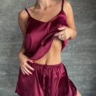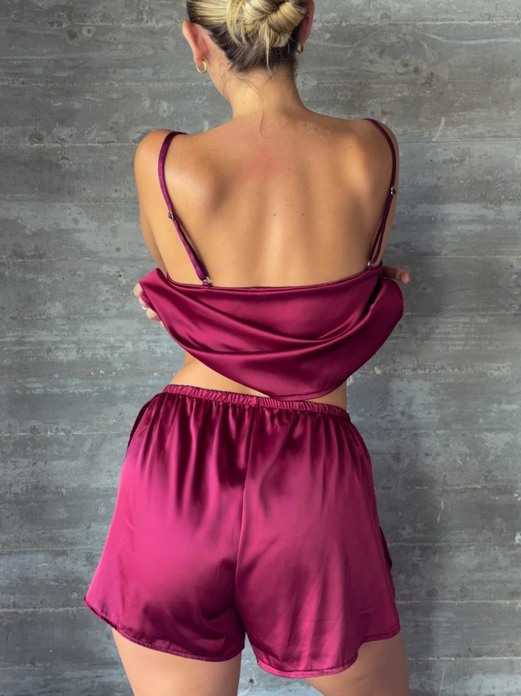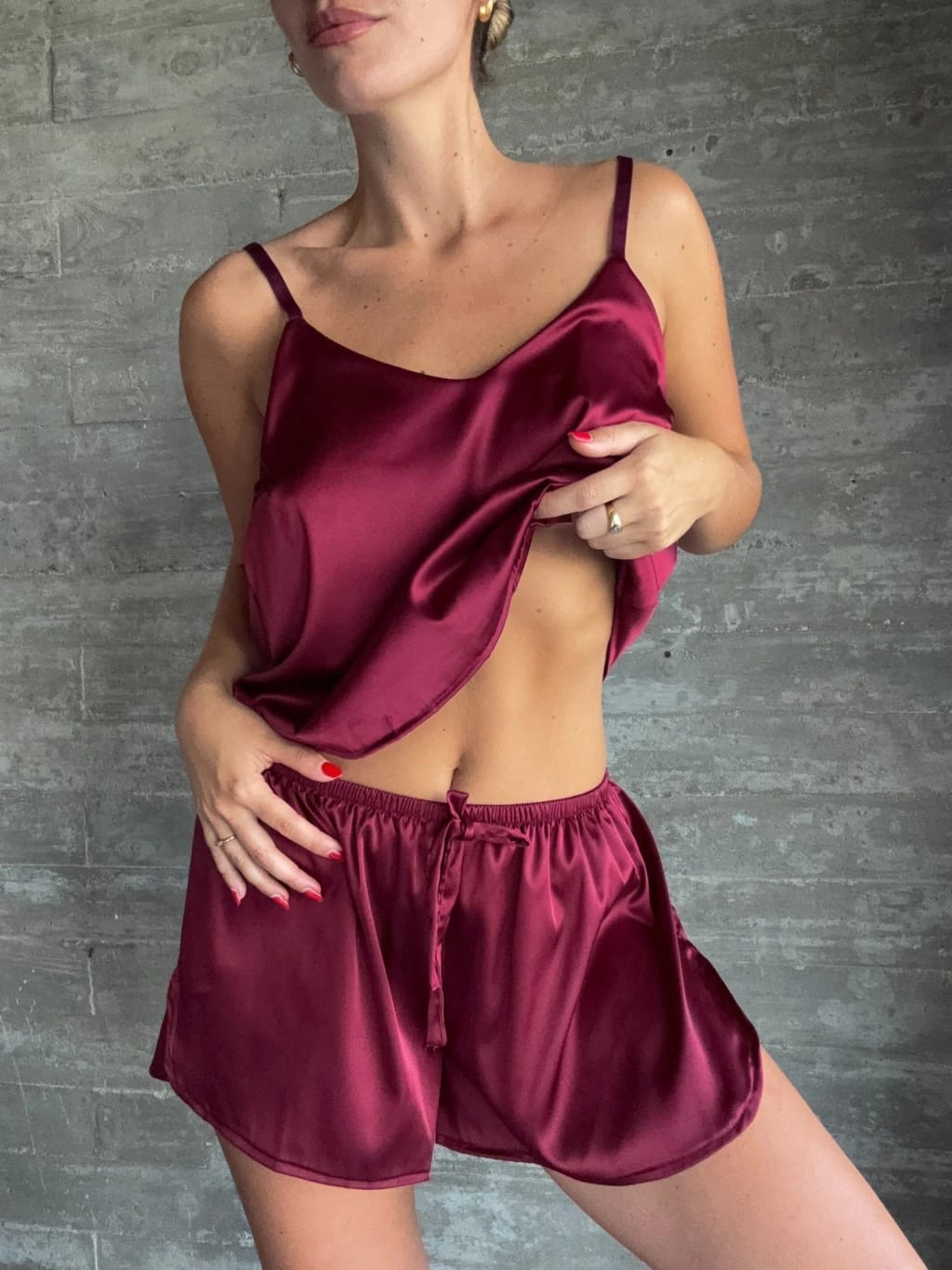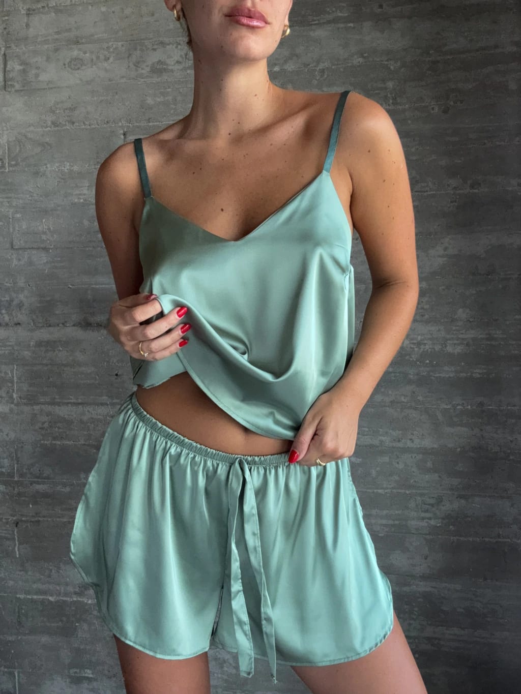 Pijamita de sedita. Top escove V, con forro y breteles elásticos regulables + Short con tajos cruzado en piernas y tiras para atar.
