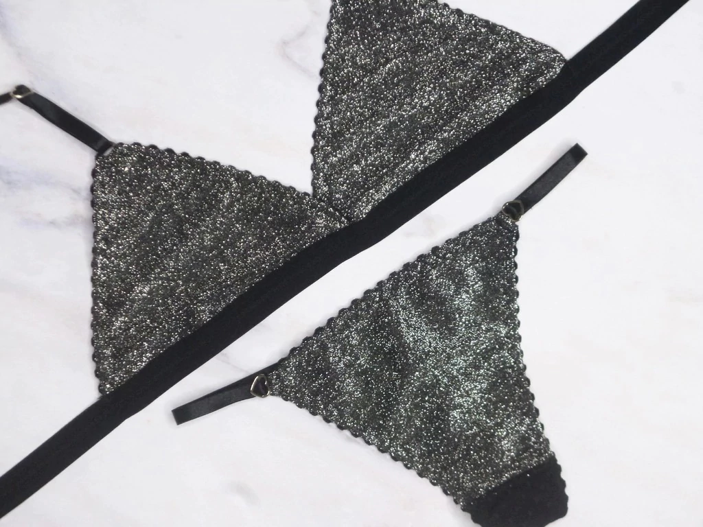 • Corpiño triángulo realizado en lurex con lycra color gris oscuro, con cintura color negro, cierra con gancho de tela en espalda. Breteles rasados regulables.